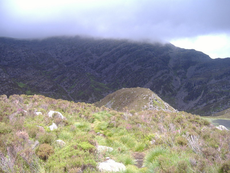 Descending from Llyn Hywel to Bwlch Drws Ardudwy with the rather ominous looking Rhinog Fawr in cloud ahead