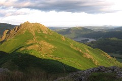 After the prolonged tea break, I took advantage of the public toilet, and then pushed on up Greenup Gill. It was a lovely valley, fairly easy going, lots of little waterfalls and pools, and nice views back down to Borrowdale. My dad came with me to near to Lining Crag, and then headed back down. I went slightly astray at Greenup Edge Pass, I think I was concentrating more on the views than on the various cairns and fenceposts that I was supposed to be following, but a quick map check and compass bearing got me back across to the proper path across Wythburn valley. At the top of the Easdale valley I took the high route, and found an excellent bivi spot on the fellside, rather more comfortable than the previous night, on a nice flat grassy ledge, with superb views over Grasmere. I cooked up instant noodles with added cashew nuts for tea, then sat and watched the evening sun on Helm Crag and over the Helvellyn range.