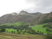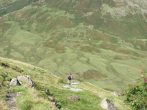 The campsite reception did breakfasts from eight o'clock, so after packing up we went and got cups of tea and veggy sausage rolls, which was a good start to the day. We were finally on the move just after half past eight. It was already sunny, with clear blue skies. We pushed on along the easy track up the valley alongside Mickleden Beck, with amazing views ahead to the craggy fells at the head of the valley, where there was a small cairn, and a sign pointing to Esk Hause to the left, and Stake Pass to the right. The route took the right hand fork and started climbing up to Stake Pass. The climb was rocky and steep at first, but then flattened out a bit to cross a plateau of grassy lumps, before reaching the top, where superb views of the Langstrath valley appeared.
