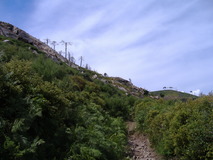 From the top, the path descended, it was quite rough, and occasionally went over bare rock slabs. There was great excitement as I came across a salamander standing in the middle of the path at 1700m. The path went into trees, with huge rock outcrops on either side of the valley. I felt a bit rushed, as I didn't want to arrive at Vizzavona while everything was shut for a long lunch, so I made a brisk pace along this stretch. It seemed to take a long time to reach the Cascade des Anglais, but eventually I got there. The Cascade Bar looked like a nice spot, and very tempting, but I pushed on over the footbridge instead. The last bit to Vizzavona was on wider tracks. The dog walked just in front of me, and barked at everyone we came across, which didn't exactly endear me to the passers by. Eventually the path popped out the road above Vizzavona (920m), where it was just a short walk down past the hotel to the station and shop.