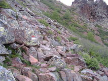 The path crosses the gap at Bocca a i Stagni (2010m) before dropping down to the small ski station at Haut Asco (1422m). Literally just before arriving at the gap, you pass a path traversing off to the right, beside a wooden post, which is actually the course of the 'old GR20'. You can still see the faded red and white flashes on the rocks. The old route avoids Haut Asco and stays high to push on along the crest past huge rock towers, to rejoin the current GR20 below the start of the Cirque de la Solitude. It was a bit late to push on, but if I had started off from Carozzu that day, then I would have been very tempted to take the old route with its better scenery and push on through the Cirque to the Tighjettu refuge.