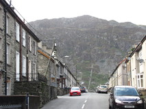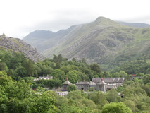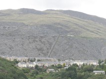 Idwal Cottage was quite a popular spot, there was a small serving hatch, lots of people sitting about on benches in front of it, and walkers and climbers arriving all the time. We got a couple of cups of rather stewed tea and some crisps from the hatch, and sat in the sun for a while. From here the route took a quiet back road down the impressive wide valley of Nant Ffrancon, only a handful of cars, and a few groups of cyclists went past. As the road turned right to rejoin the A5, we continued on gravel track, with views of the Penrhyn slate tips straight ahead of us. I had done this bit before, on Day 6 of the Snowdonia Way, but it went on for a lot longer than I remembered, the slate tips just keep on going! Part way along we spotted some strange movement out of the corner of our eyes, which turned out to be people flying past on a zip wire that they have built in part of the quarry. We reached Bethesda main street, which was the official end of the Slate Trail, at five o'clock. With uncanny timing, the second we arrived at the bus stop, before we even had a chance to look at the timetable, the bus to Bangor arrived and we jumped on.