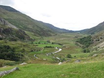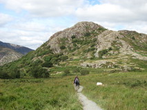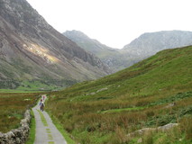There wasn't a lot at Capel Curig, but the outdoor shop had a vending machine, so we got a couple of cups of tea and adjourned to the benches outside the shop to watch the comings and goings, and finished off the grapes that we had left over from last nights picnic. From behind the outdoor shop, an easy track headed off along the valley, and we made quick progress, with increasingly impressive side-on views of Tryfan. As we neared Llyn Ogwen, we crossed over the A5, and went round the back of the lake. It was rougher ground, over rocky bits, and a few marshy bits with stepping stones, which slowed us down quite a bit. As it was a Sunday, there were lots of people out, and looking across to the other side of the lake we could see bumper to bumper cars and vans parked up in the lay-bys alongside the A5. As we neared the end of the lake, there was a boulderfield that required some clambering, to reach the A5 again at Idwal Cottage.
