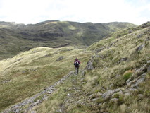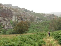 The B&B had a DIY breakfast setup, where they left you to your own devices in the well-stocked kitchen. It worked well, although we were a bit lax in getting going and were finally on the move just after half past eight. It was overcast, but dry, and according to the forecast there was going to be a couple of hours of rain in the morning, but then dry for the rest of the day. We made the short detour to see Beddgelert's grave, then headed along the river of Afon Glaslyn, passing a chap walking along in bare feet. A lovely section, through steep sided gorge, water crashing through the rocks and large boulders, and the path gets rockier the further down you go.