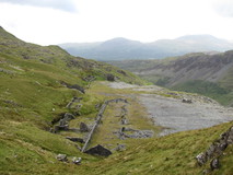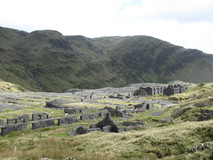 The route climbed an old mining track out of Croesor, which seemed to go on for ages, although it was easy going, wide track with an easy gradient, and there were good views across to Cnicht on the other side of the Croesor Valley. About half way up the track, the rain stopped, just as predicted by the forecast, so we were able to take off our waterproofs. The track eventually turned a corner and there were the old workings of Croesor mine, with a large spoil tip, remains of old abandoned buildings, and we could even look into the mouth of the tunnel leading into the hillside. Shortly after the abandoned workings we reached the high point for the day, then headed across the Moelwyn plateau, across an old dam, then traversing quite lumpy landscape. There were superb views all round, and an interesting lighting effect as patches of sunshine quickly blew in and out. The massive spoil tip of Rhosydd mine came into view, shortly followed by the ruins of the mine buildings. The old mine buildings are quite an eerie sight, what looks like the remains of an abandoned small village, in the middle of nowhere, halfway up a mountain!