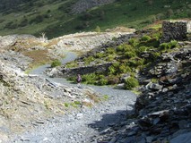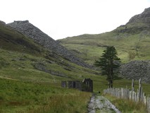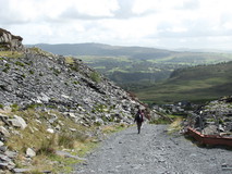 We now joined the route of Sarn Helen, an old roman road, which we hoped would mean a slightly more solid track, but the marshy ground continued, and in places we slowly picked our way across rocky hillside to avoid sloshing about in the bog below. Eventually we left the roman road route and dropped steeply down into the valley of Cwm Teigl to join a narrow road. After the marsh it was quite pleasant to be on something solid, and we followed the road as it climbed up to the entrance to the Manod Slate quarries. The sun even came out, and the valley was a bit of a sun trap, so it was quite warm climbing up the steep road. At the top of the road, we joined some tracks which took us to the remains of the Rhiw-bach quarry. The approach was rather impressive, after nearing the quarry on a flat track, the path turned and dropped down the old quarry incline itself, to reach the ruins of the old quarry buildings, and we had a look around before pushing on.