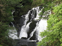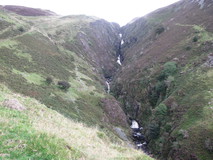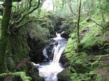 The pub breakfasts normally started at eight, but they were happy to do a half seven start for us, and a few other guests seemed to be doing the same thing when we got down to the dining room. We were on the move again just before eight, and dropped down to Cwm Cynfal, which was a superb section, a steep sided gorge full of waterfalls, cliffs, and thick moss covering everything. After passing Cwm Farm, views appeared of the impressive large waterfall of Rhaeadr y Cwm, and the route climbed up the hillside to one side of it, then crossed over a road to enter an area that the book described as 'extensive dry heathland and blanket bogs'. We certainly found the blanket bogs, but I don't think we found anything that could be described as dry heathland. As we floundered through some tall ferns next to an abandoned farmhouse, we came across two chaps who were also doing the Slate Trail.