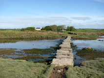 It was another nice day, and the sun woke me up just before seven. I quickly got packed up and on the move, and was back down at the path by twenty to eight. There was nice walking on sandy path beside the dunes before arriving at some large marram grass sculptures at Llyn Rhos-ddu. Two farmers were just blocking off the road with a trailer so they could send their cows across it to another field, and politely apologised for the inconvenience, but it was easy to squeeze past. Just after the sculptures I passed by another campsite, literally right on the route, that might be useful if you want to stop a little bit further on past Newborough. The path now left the road and traversed a number of fields to get back to the shoreline, including a crossing of Afon Braint on gigantic stepping stones. There was a marshy area after the stepping stones, and then some fields of taller grass, still wet from the morning dew, so I stopped and put my waterproof socks on.