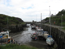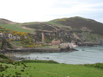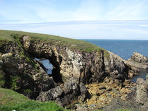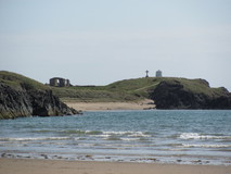 I got started at quarter to nine, and did the short stretch to Amlwch, where I got a full veggy breakfast and pot of tea at a small cafe. There was an excellent section after Bull Bay, with rocky coastline, lots of little inlets and cliffs, and some ups and downs. At Porth Wen, an old disused brickworks appeared on the far side of the bay, down beside the water, with a small rock arch nearby. Then the route went out to the 'most Northerly point in the whole of Wales', marked by the remains of a rather nondescript concrete building. More ups and downs past ruins of another old building, and more good scenery before coming across the little church and graveyard of Llanbadrig, on a headland just outside Cemaes. I detoured into town and got beans on toast and a pot of tea. I was a bit short on supplies, and there didn't seem to be much in the way of facilities on the next stretch. There was only a small shop in town but I managed to stock up with some pot noodles, malt loaf, and granola bars.