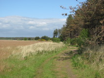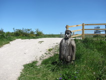 I got an early start the next morning, and was on the move just after seven. The rain seemed to have completely passed over, although everything was still quite wet. The route took a mix of quiet narrow roads and small footpaths to start with, with nicely trimmed grass. I was almost out of water, and wasn't quite sure where I was going to fill up, when the footpath passed by a house, where there was a sign inviting walkers to use their outside tap, for themselves and thirsty dogs. A rather public spirited act, and very welcome! Further on, some hastily pinned up warning notices appeared about a landslip on the coast path, together with some not particularly clear details of a diversion. I pushed on anyway, to see what the situation was, and sure enough a huge chunk of the narrow car track had disappeared off down the hillside, leaving the fence hanging in mid air! It had certainly made the track undriveable, but on foot I found it easy enough to skirt round.
