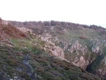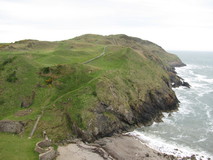 The weather had gone downhill a bit, and it was drizzling when I left Holyhead, and a large grey cloud had settled on top of Holyhead Mountain. I felt a bit weary on leaving the town, and it was a bit of a slog to get to the start of the country park, past a strange mock castle that was derelict. However once in the country park, the walking was good, despite the gloom and occasional spell of drizzle. The path climbed a lovely rocky hillside, and there were superb views down to the cliffs at North Stack. Then the path came to a steep drop, where you could peer down to the South Stack lighthouse way below. After South Stack, the weather seemed to have cleared up a bit, and it was turning into a nice evening again. The path followed the road for a little while, then turned off to do a circuit of The Range. I left the route here to get to the campsite at Penrhosfeilw. After cooking tea, I popped out and did a brisk circuit of the Range, to avoid having to backtrack the next morning. I was rewarded with some good views of the South Stack lighthouse under the evening sky. It was quite a nice stretch, lots of inlets with sheer rocky slabs, and easy going without the rucksac on so I could breeze along. At Port Dafarch the path traversed under ivy and flower covered cliffs to get back to the road. I got back to the campsite just as it was getting dark.