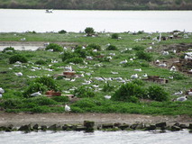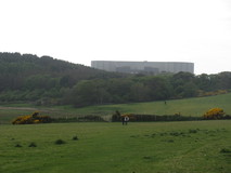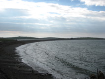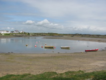 After Cemaes, the path did a circuit of Wylfa Head, before skirting round the Wylfa Nuclear power station on a nature trail through a forest. The trail wasn't too bad, with grassy path, and just the ever-present background hum of the power station, and a radiation detector every so often suggested that it wasn't a typical nature trail. Further on, the trail went right under the base of a huge pylon, then past power lines coming out of the side of the building amongst a mass of huge insulators. It was half past four when I crossed the access road to the power station, and it must have been the end of a shift, as there was a non-stop stream of traffic, all leaving. Further on at Cemlyn the path crossed a pebble bar, which was slow walking. The bar held back a lagoon, with a small island that was covered with terns. In the middle of the pebble bar were a few people with long lens cameras and tripods, watching the birds. At the other side of the bar was an intriguing house, surrounded by unusually tall brick walls. Two of the bird watchers were discussing it, and the walls had apparently been to keep the wind out to allow the owner to grow exotic plants and trees in their large garden.