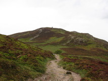 I pushed on along the beachside path, it was still very windy, the sand had blown right over the path in some places, and there didn't seem to be many people out, apart from the more intrepid dog walkers. The final stretch across the bridge to Conwy gave superb views of the castle through the drizzle, although I was feeling a bit bedraggled by this point. I quickly adjourned to a cafe in town, and got a full veggy breakfast and pot of tea. Shortly after leaving town, the route split, and there was a choice of plodding along flat tarmac paths beside the main road, or the high level option via Conwy Mountain and Sychnant Pass, with interesting terrain and good coastal views. I went for the high level option, and it turned out to be very enjoyable, pleasant grassy paths, and there were indeed some great views in places, despite the drizzle. It was well signposted, although it would be a lot more more tricky if any of the signposts disappear, so you might want a backup map and compass for this bit, especially in poor visibility.