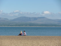 At the beach at Aberffraw the route turned inland and followed the river to reach the village and the bridge. There was a small cafe with picnic tables outside. The staff seemed to outnumber the punters when I arrived, but lots more people soon turned up and filled up the outside tables. I got a veggy breakfast and a pot of tea. After the village the path crossed the small bridge and then followed the river back out to the beach. Unlike most beaches, where you have to search for the strip of firm sand nearer the water, on this one the entire beach seemed to be an expanse of firm flat sand. In the middle were a couple of blokes surrounded by buggies and various wheeled boards. Unfortunately that was the last of the sea for a while, and the route turned inland through the dunes, followed by fields with some slightly jittery bulls, then some road walking. Descending the very quiet road to Malltraeth gave some absolutely superb views over Malltraeth Sands to Newborough forest, with the ever-present mountains in the background.