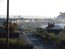 The cycle path finally arrived at the promenade of Colwyn Bay, and I pushed on to Rhos-on-Sea, where I stocked up on some rosemary bread and houmous at a co-op, and adjourned to a seat on the front for an evening picnic. Looking at the internet, there seemed to be a backpackers hostel in Llandudno, and a quick phone call revealed that they had exactly one bed left for the night, in a seven person dormitory, which I bagged. After the picnic, I pushed on to the Little Orme, which was a lovely spot in the evening sun, then made the short but stiff climb to get up to the top and over to the other side. Superb views of Llandudno appeared on the descent, with the entire front stretching out in a long curve in the evening sun, although there was a curious column of smoke rising from the middle of town. I made the hostel for half past eight. The smoke that I had seen from the Orme turned out to be the top floor of a building in the next street from the hostel, which was on fire, and firemen on a very long ladder were trying to put it out. Fortunately, they seemed to have it under control fairly quickly.
