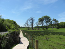 Back at the shoreline, there were some stretches along the pebbly beach to get to Moel-y-don, where I sat down for a snack at a picnic table, and laid the tent out to dry. I finished off the houmous, which surprisingly was still OK from the previous day. It was a nice spot, with good views over the water, and a few cars came and went, and people got out and looked at the view. According to the book, there wasn't a path for the next bit, and it recommended getting a bus to avoid having to walk along the main road. That seemed a bit drastic, and studying the map it looked like at least the first half of it could be done by stringing together various footpaths. I left Moel-y-don and walked up to the main road, to decide what to do next. The traffic actually seemed very light, and there was enough of a verge to move to the side when the occasional car came past, so I pushed on along the road. Half way along I was surprised to find a brand new section of off-road path along the edge of the field, separated from the road by the stone wall. It looked like it was joined by the footpaths that I had been contemplating for the first half. Another excellent improvement!