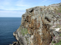 Despite the comfortable spot I didn't sleep that well for some reason, and ended up having a late start. After the short walk down the road to regain the route at Port Dafarch it was already nine o'clock. At Trearddur there were quite a few divers busy kitting up on the front. I was looking forward to breakfast, but there didn't seem to be much in the way of places that were open. I did stock up on houmous, bread and tomatoes, from the village shop, for a picnic later on, plus some more pot noodles for evening meals. It was a nice sunny morning, and there were lovely stretches after Trearddur, walking on short grass, with patches of colourful flowers, and good rocky inlets and cliffs. At Rhoscolyn there were some excellent cliffs, and a climber was just topping out as I arrived.