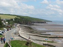 The cafe was a bit too comfortable, and I didn't get going again until almost ten. There were some pleasant wooded sections with some ups and downs through little valleys, and occasional views back to Tenby through gaps in the trees. As it was a Saturday, Saundersfoot was very busy, and there was a brass band playing. I got a couple of sports drinks and polished them off, then pushed on, through a set of narrow pedestrian tunnels that emerged on a promenade that led to Wisemans Bridge. A little bit of road walking followed by a concrete path got me all the way to Amroth at half past twelve.