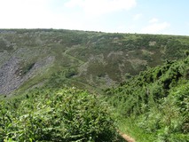 I pushed on past the pleasant waterfront at Parrog, with a cluster of small cottages overlooking the boats on the sandy beach alongside the river. The cliffs changed in character from those earlier in the day, the rough layered rock was replaced by smooth slate cliffs, often vertical or overhanging, and usually topped with pink flowers. After passing the remains of the church at Cwm Yr Eglwys, I headed out to do the circuit of Dinas Island. At the trig point at the far end, sweeping views suddenly opened up to Goodwick. At the end of the circuit, there was a sign for camping, which took me uphill on a small farm road. Last thing in the day the extra climb was a bit unwelcome, but I was rewarded by a pleasant camping site, with the whole site to myself! I brewed up a pan of tea, followed by curry flavour instant noodles, then after a piping hot shower I was tucked up in my sleeping bag by ten o'clock.