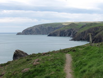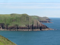 Near an old chimney, a huge dragonfly went past, and I spent a fruitless five minutes trying to get a photo of it, but it just wouldn't stay still for any length of time. The path round here had shiny black stones embedded in it. At Nolton Haven two swimmers in wetsuits were heading out for a circuit of the bay, although they were hampered by their six collie dogs trying to follow them into the water, and they had to shoo them back. They made good progress though, and by the time I had climbed up to get above the harbour they were already out at the edge of the harbour. After Nolton Haven I passed an intriguing tellytubby like house that was half buried under the grass. Shortly after the teletubby house I bumped into a chap from Vancouver going in the opposite direction, and also camping. We stopped for a chat and compared notes on the coast path, and other trails in the UK, Europe, and beyond.