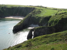 By nine it had dried up enough to take off my waterproofs. The walking was easy going, on grassy path, through rather dead looking gorse, and occassional bushes. Solva suddenly arrived, and I followed a pleasant flower lined path down to the harbour. After a quick look round Solva I pushed on, past a impressive row of old lime kilns. There were some superb inlets with towering cliffs surrounding them. At Newgale I adjourned to the cafe for beans on toast and a pot of tea. Beside the beach was a very new looking road where the old road and the protective shingle bank had apparently been washed away in the storms earlier in the year.