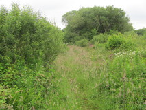 I topped up with water, and had a couple of sports drinks before pushing on. The path now headed away from the coast on a cycle path beside a fairly quiet A-road. The cycle path eventually ran out, and the route took to field edges, sometimes on open fields and sometimes in fenced off corridors along field edges. There were lots of damselflies along some of the fenced in sections. Somewhere along here I felt something spiky in my shoe, which turned out to be a long thorn that had gone right through the sole of my approach shoe, through the sorbothane insole, and was now sticking up between two of my toes. It was very tough, like a small nail, and stuck fairly solidly, but I managed to push it back out by pressing on it with a coin from inside the shoe.