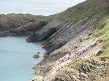 It was raining when I woke up, and I needed full waterproofs on when I first got going. I was back on the path at twenty past seven. There were lots of snails on the path. The rain soon eased up and then seemed to be mainly holding off, apart from a couple of showers that passed by. There was some amazing strata along this stretch, huge folded slabs where the layers were exposed. I noticed the tips of refinery chimneys appearing off in the distance for the first time. After a couple of hours the sun made an appearance. There were good views ahead to the huge sweeping coastline of St Brides Bay, and I could literally see the weather on the move, as patches of sunshine gradually made their way along the coast. At Caerfi I passed a campsite with two luxury yurts quite near to the path, which had their own gas bottles and solar panels outside.